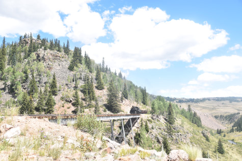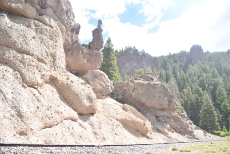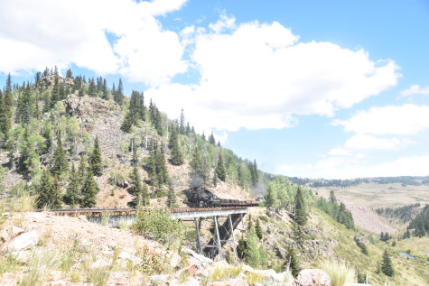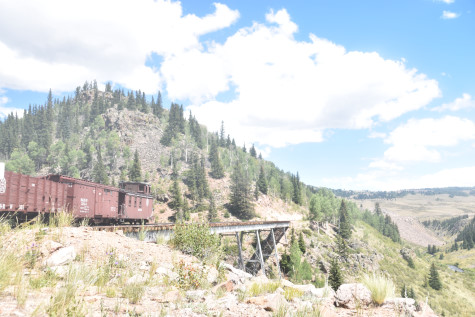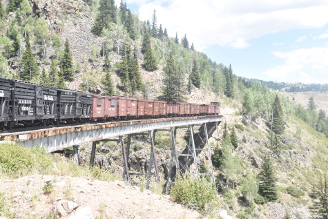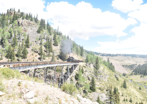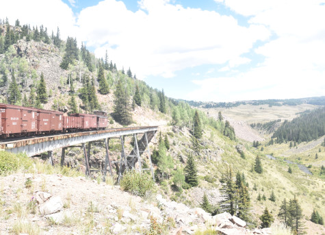 Cumbres and Toltec Scenic 2-8-2 487. Today, we partook of lunch in the Lunch Room and I enjoyed the turkey, mashed potatos, gravy, lemonade and chocolate cake. Once everyone was fortified, we reboarded our train and went to Cascade Trestle.