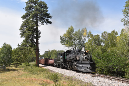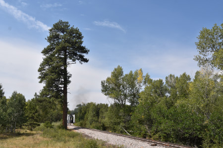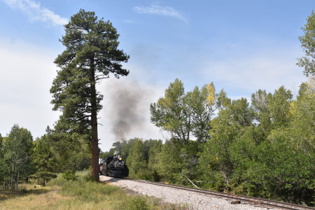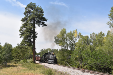 Cumbres and Toltec Scenic Railroad 2-8-2 487, nee Denver and Rio Grande Western 487, built by Baldwin in 1925, passing the ponderosa pine named for Fred Jukes, an accomplished photographer.