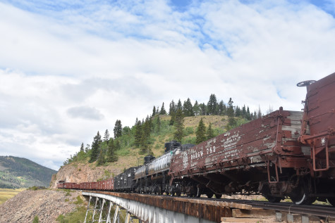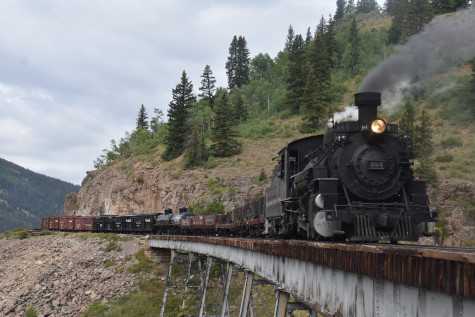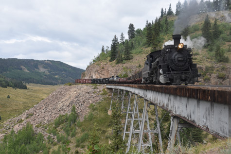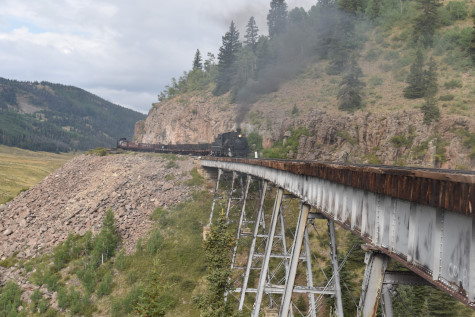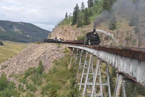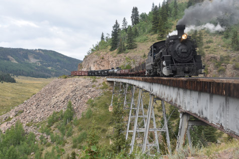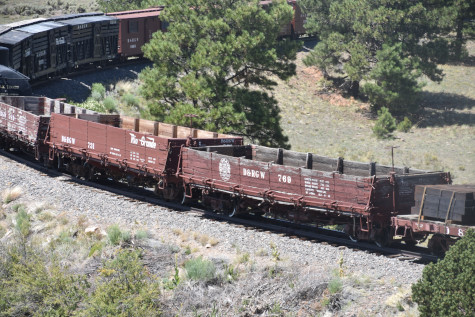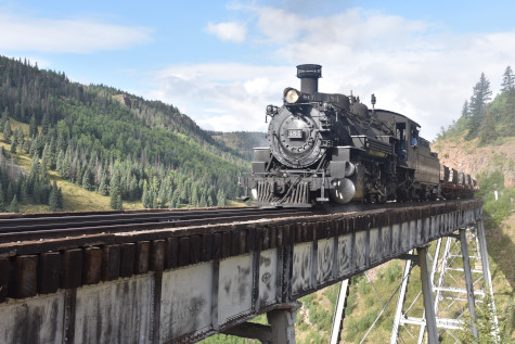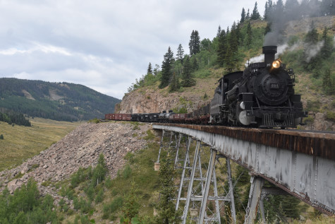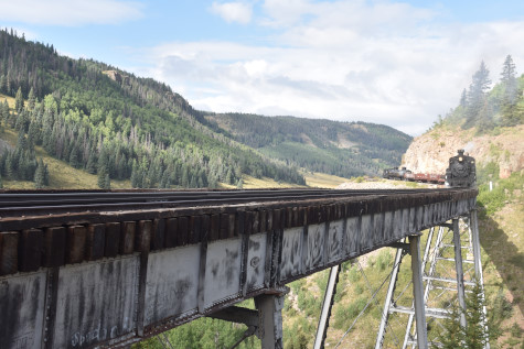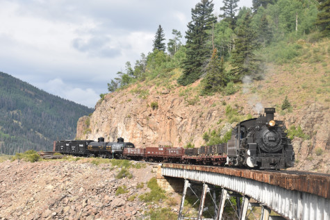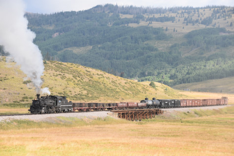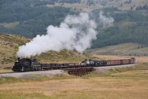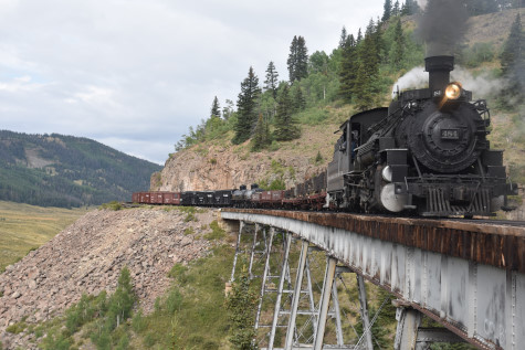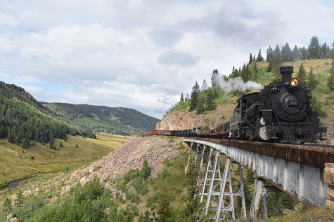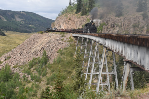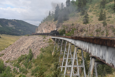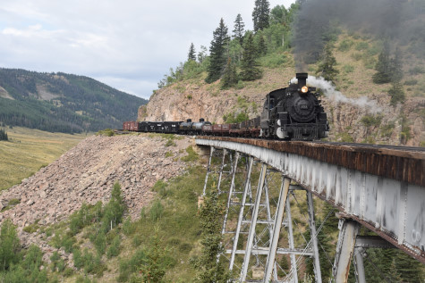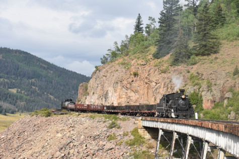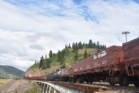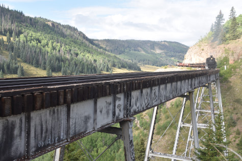 Cumbres and Toltec Scenic 2-8-2 484, nee Denver and Rio Grande Western 484, built by Baldwin in 1925 at Milepost 319.95, Cascade Trestle, which is 136 feet high and 409 feet long. The original bridge was wood, but it was replaced in 1889 with an iron bridge of a unique German design with bents that were tapered at each end. It also did not have any cross-bracing between the bents. In the 1920's, a new eight-span steel deck-girder bridge with steel bents placed on masonry pedastels and abutments was built to standard gauge specificitions, in the event the line was standard-gauged.