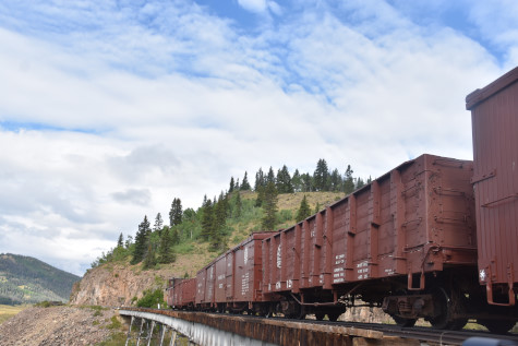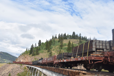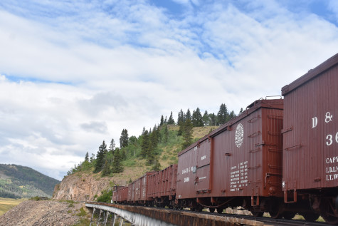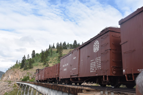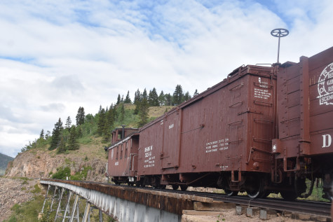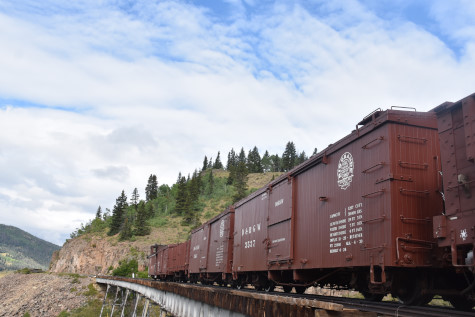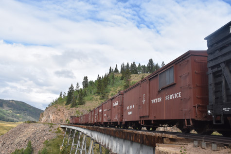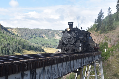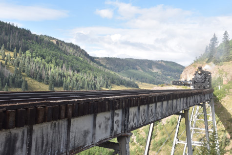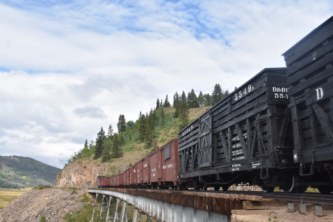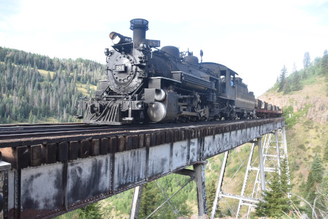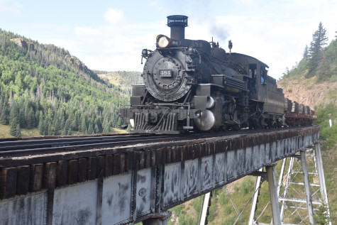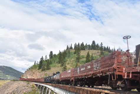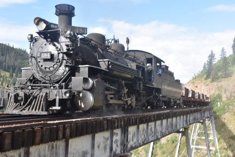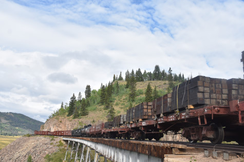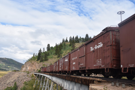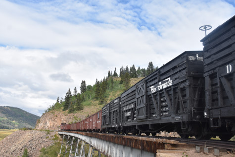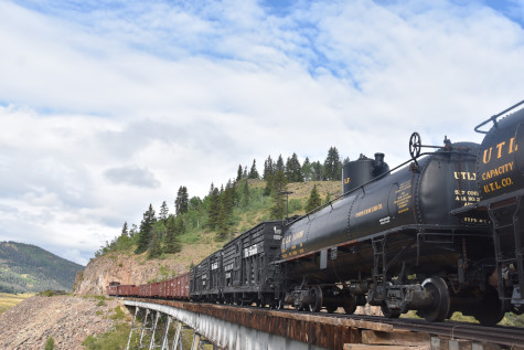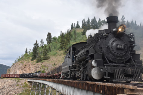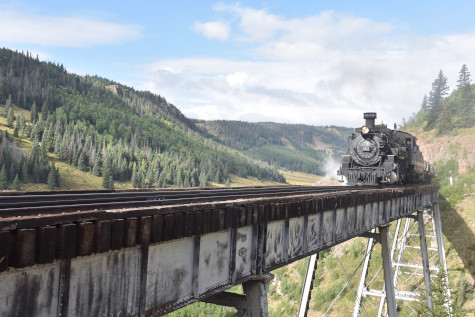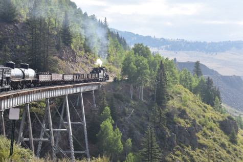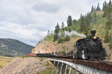 Cumbres and Toltec Scenic 2-8-2 484, nee Denver and Rio Grande Western 484, built by Baldwin in 1925 at Milepost 319.95, Cascade Trestle, which is 136 feet high and 409 feet long. The original bridge was wood, but it was replaced in 1889 with an iron bridge of a unique German design with bents that were tapered at each end. It also did not have any cross-bracing between the bents. In the 1920's, a new eight-span steel deck-girder bridge with steel bents placed on masonry pedastels and abutments was built to standard gauge specificitions, in the event the line was standard-gauged.
