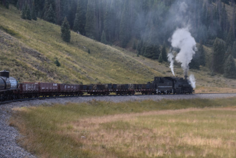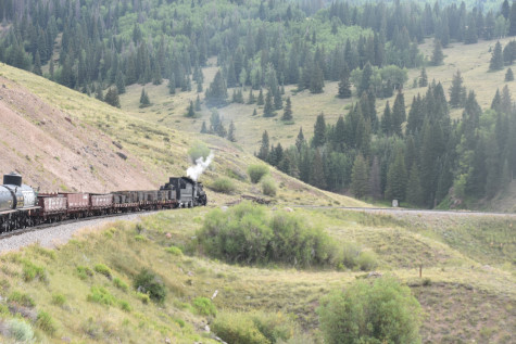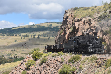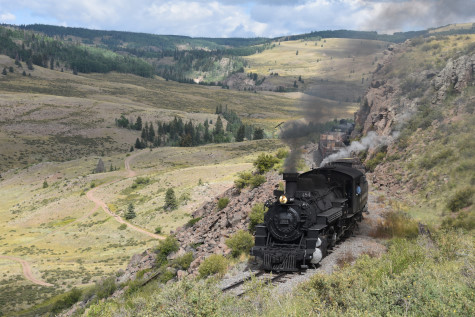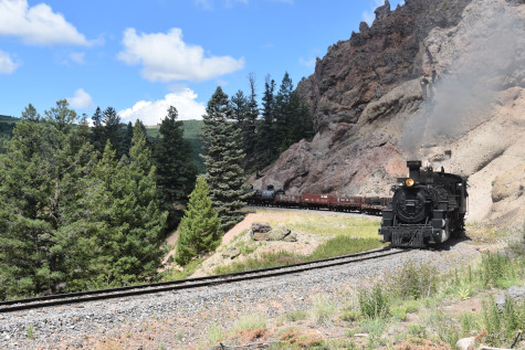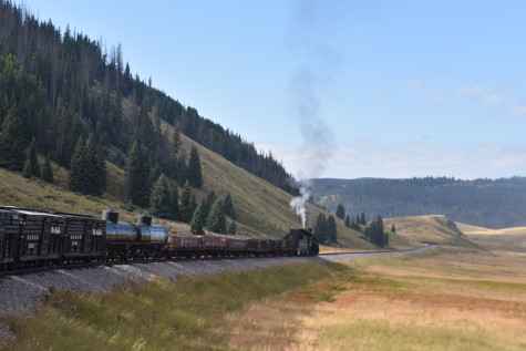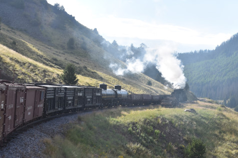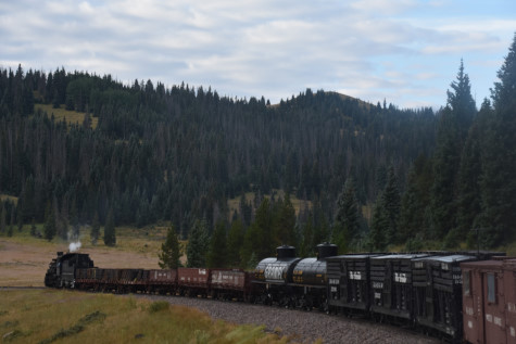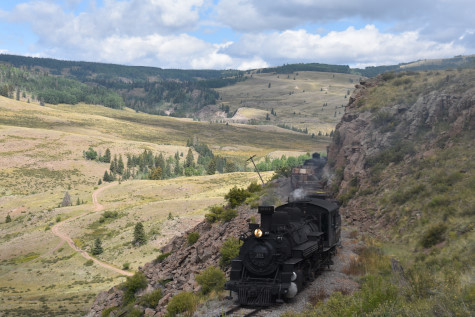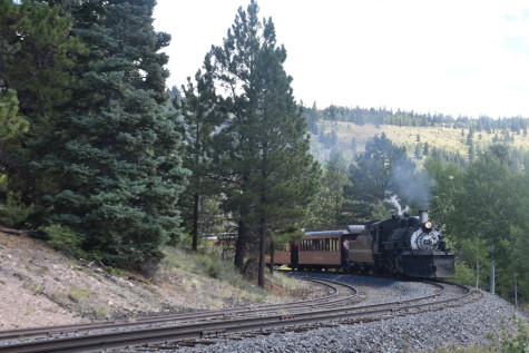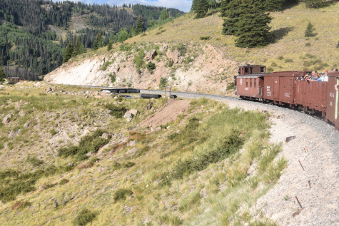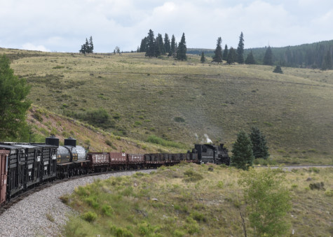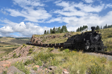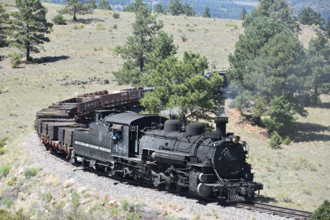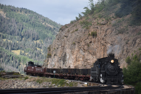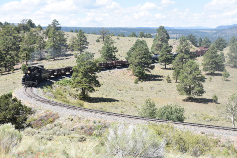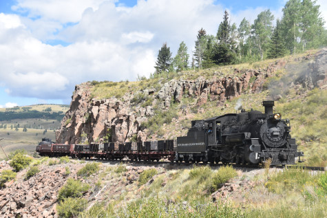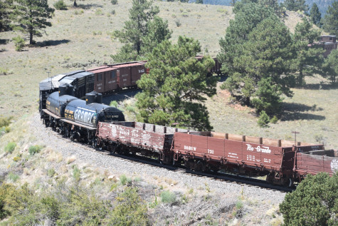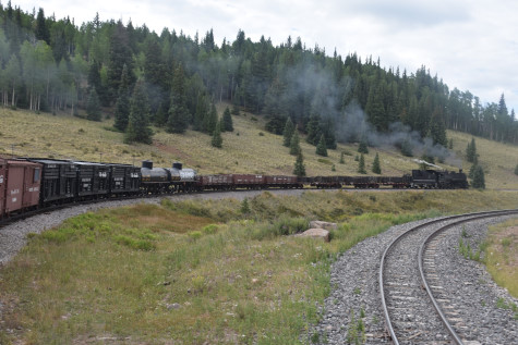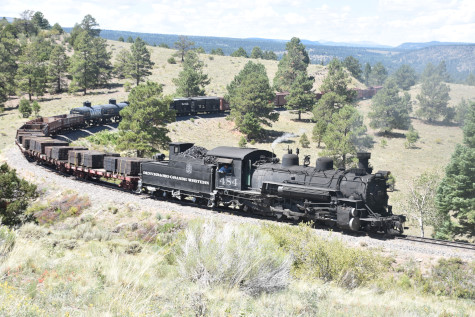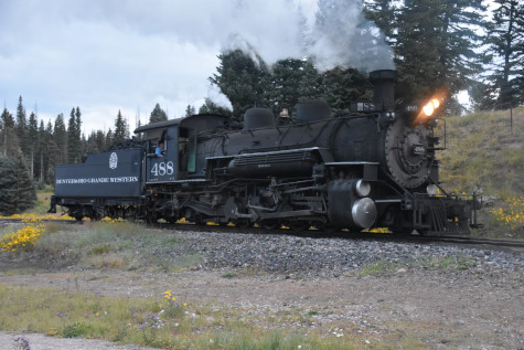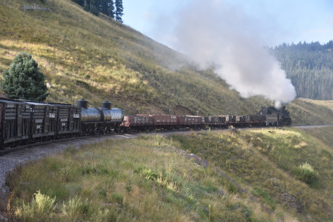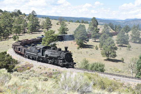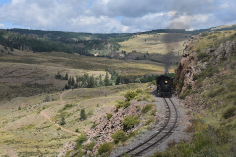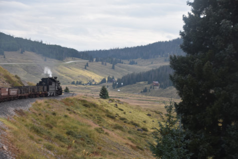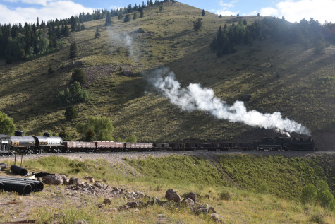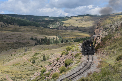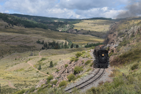 Cumbres and Toltec Scenic 488 rounded a descending curve.