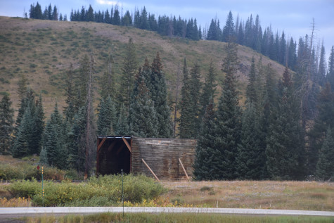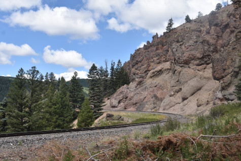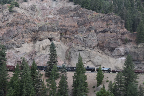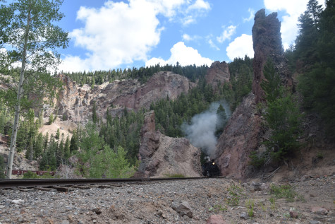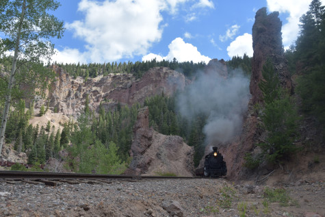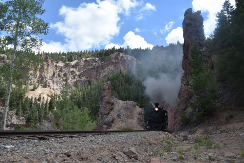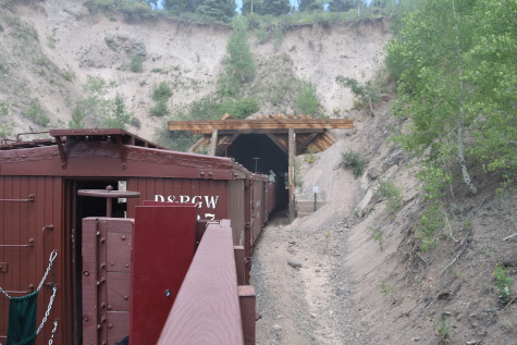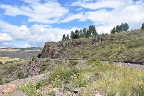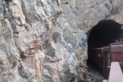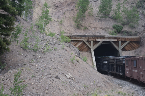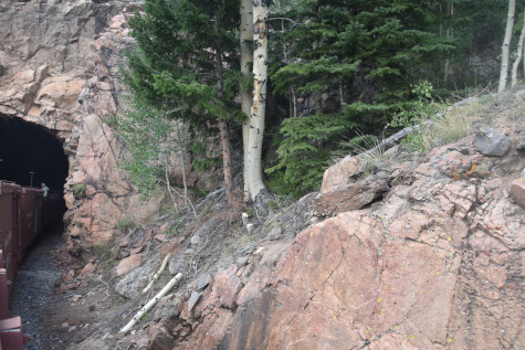 We entered Rock Tunnel at an elevation of 9,631 feet. This 366 foot curving tunnel was blasted out ofthe Pre-cambrian cystalline rock, was enlarged in 1937 and is 600 feet above the river.