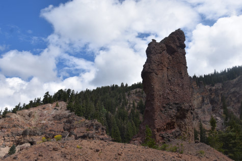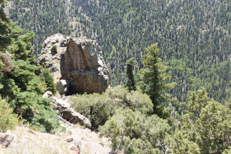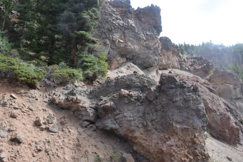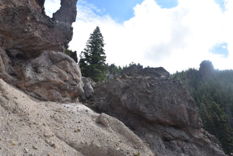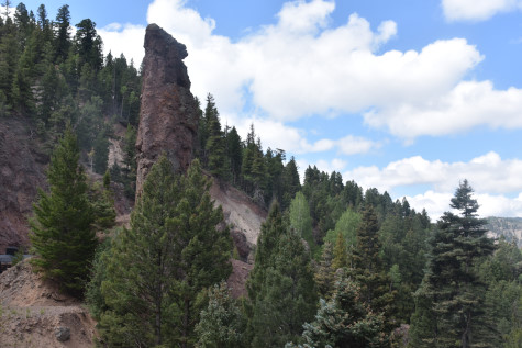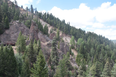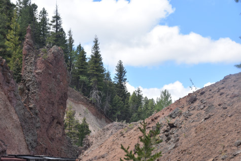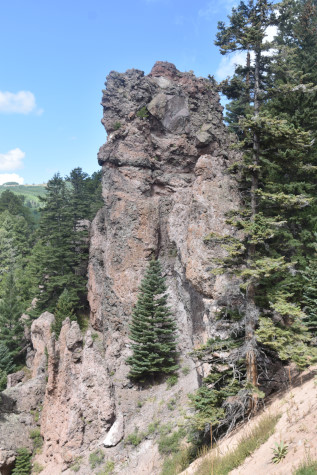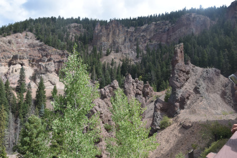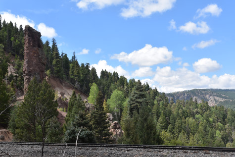 A phantom in a curve. The tracks wind back and forth around tall pinnacles, spires and pedestral rocks formed from breccias of the Conejos Formation. The weird shapes are the result of the alteration by hot water, by weathering and by erosion of the volcanic rock. The alteration also causes the wide variety of colours seen in the rocks along the section of track.