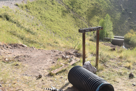 A large drainage pipe cut into the right-of-way to take the water under the tracks.