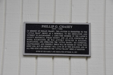 In memory of Phillip G. Chasey {1919-1996} this station is presented to the "Little Train Group", a memorial to his dedication and to his interest in railroading. A long time member of the La Porte County Historical Steam Society and an avid support of model railroading. He was actively involved in building, maintaining and operating the "Little Trains." His expertise, craftsmanship and friendly smile by missed by people who knew him and his memory will live on in this building and all who ride the "Little Trains" here at Hesston. Given by his family and dedicated October 18, 1997.