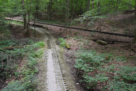 The track diagram of the railway. The orange is the 1/4 and 1/8 scale and the red is the narrow gauge.