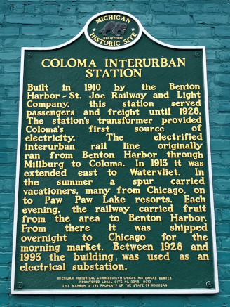 Our second stop was in Coloma for the Benton Harbor-St. Joe Railway & Light Company interurban station built in 1910. The company operated an electric railway from Benton Harbor to Watervliet with branches to Paw Paw and Dowagiac between 1906 and 1928. Some of their line was leased from the Benton Harbor, Coloma & Paw Paw Lake Train Railway. This was originally a horse-drawn line which was electrified in 1892. The line, between the two major cities in Berrien County, expanded with routes to Fairplain, South St. Joseph and to the House of David. In 1906, a line was opened to Eau Claire and reached Dowagiac in Cass County in 1911. A second line was built to Watervliet in 1910 with a branch from Coloma to Paw Paw (Van Buren County) over Pere Marquette track. This branch also connected with the Kalamazoo Lake Shore & Chicago, extending from Toquin on that line. The Graham & Morton steamship line from Chicago to Benton Harbor provided a connection for passenger interchange both for the city and interurban lines. The line was used for hauling produce from the "Fruit Belt" to Chicago. Cars were placed at sidings along the line, loaded during the day, to be picked up by fruit trans leaving Watervliet at 4:40 pm or Dowagiac at 4:15 pm. These trains reached Benton Harbor in time to transfer their loads to the 8:00 pm Chicago boat, for delivery to the Chicago market the next morning.
