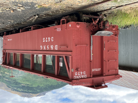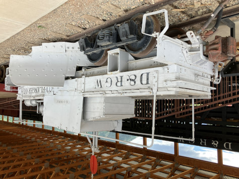 Denver and Rio Grande Western drop-bottom gondola 871, built by American Car and Foundry in 1904. The 800 series originally had slatted coke racks that raised their sides to the height of boxcars. In 1918, the coke racks were removed, six-inch side boards were added, the lever systems were altered, and under frames were stiffened with steel. Drop-bottom gondolas carried bulk material such as ore, coal, coke, sand, ballast and rock. The unique hinged unloading floors on these cars were activated by a complex mechanism of shafts, levers and chains. Before drop bottom cars were invented, material was shovelled out by hand.