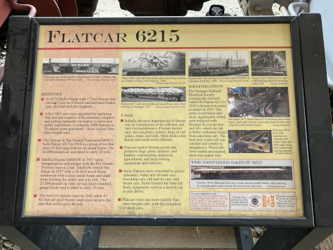 Flatcars hauled diverse goods and products into and out of the mountains and valleys of southwest Colorado. D&RGW would have used them to haul ties and rails for track maintenance. Flatcar 6215 was in service until the end of D&RGW operations in 1968 and was sold to the scrapper Floyd Reed in Alamosa probably that year. Lindsey Ashby apparently purchased it in 1973 and moved it to Silver Plume for use on the Georgetown Loop Railroad. About 2004, the car was moved to the Colorado Railroad Museum in Golden for storage then in May 2014, the car was moved to the Silverton Northern track along Cement Street, pending purchase by DRHS which occurred early in 2016.