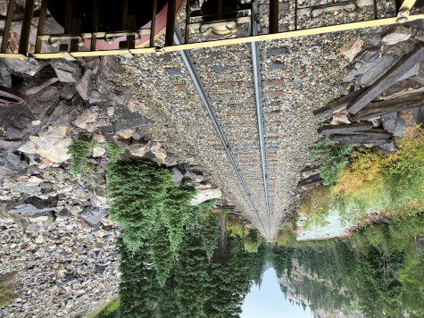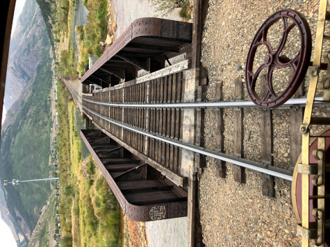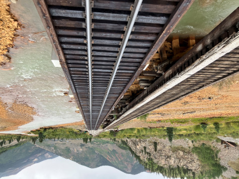 Crossing the High Bridge, Milepost 471.23. The current bridge was reinforced in 1981 to support the heavier K-36 series of locomotives {480's} that Charles Bradshaw, Jr. wanted to use on the line.