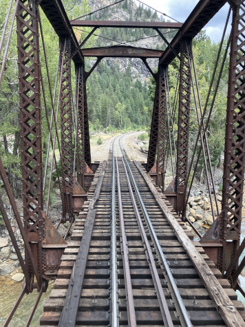 Crossing the Animas River on the steel-trussed Tefft bridge at MP 477.80.