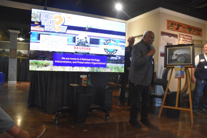 Mountain Empire Model Railroaders, Johnson City Railroad Experience and George L. Carter Chapter NRHS. Welcome National Railway Historical Society. Carson Sailor, the Vice-President of the George L. Carter Chapter, welcomed the conference attendees and spoke about the chapter's journey to this point. Scott Stodola, Chapter President looks on from behind and Dr. Fred Alsop