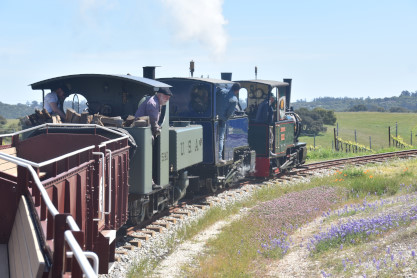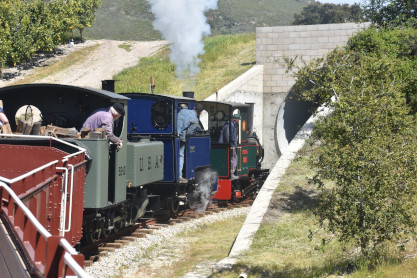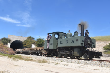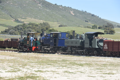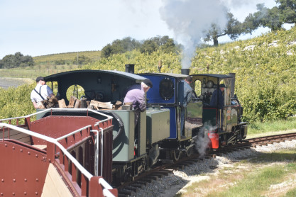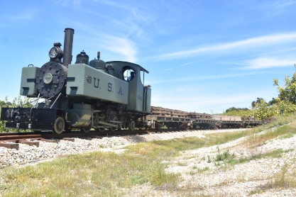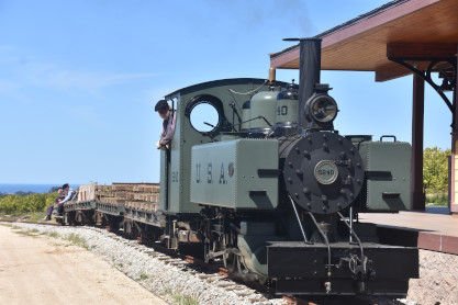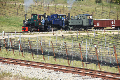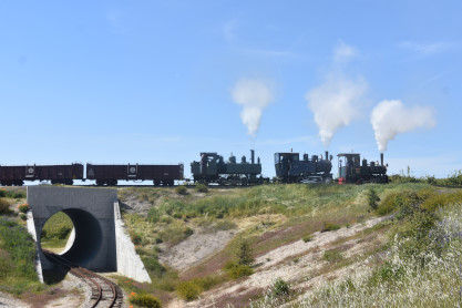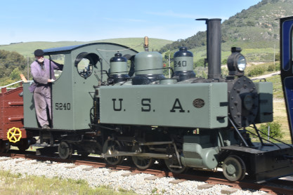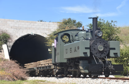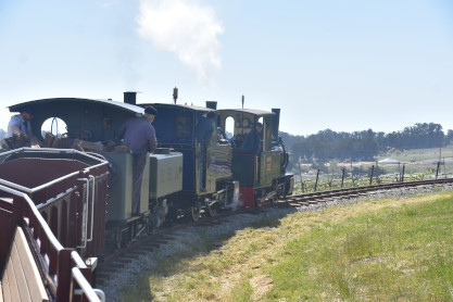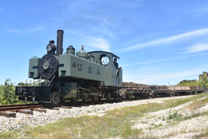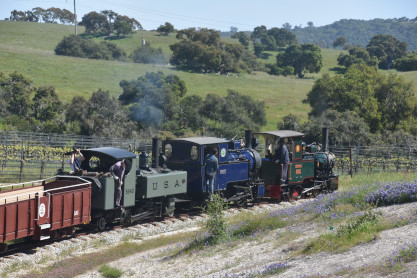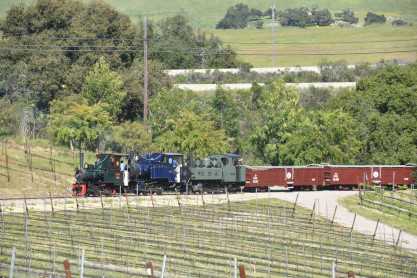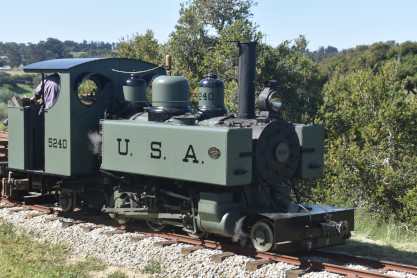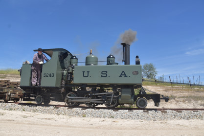 Norgrove Railway 0-4-0T 6 "Buckeye" in the lead, Norgrove Railway 0-4-0T 8 in second and United States Army 2-6-2T 5240 bringing up the rear.