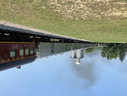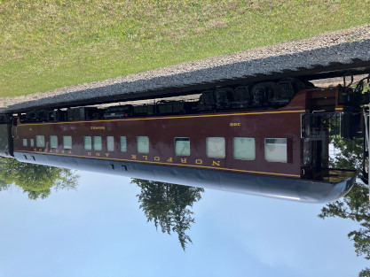 Norfolk and Western observation car 300 "Roanoke" built by Pullman in 1917. It was modernized by the Roanoke Shops in 1955, repainted and assigned the name "Roanoke" on October 15th, 1977. It was then re-nenumbered NS 5 on paper, but not the car itself, on December 2nd, 1985 then deemed surplus and sold at auction in 1987. It was rebuilt to Amtrak standards at Eastern Rail Services in 1988 and placed into warehouse storage in 1991. In 2019, it was acquired by the Norfolk and Western Business Car 300 Preservation Society, Inc. The train reversed for another photo runby.