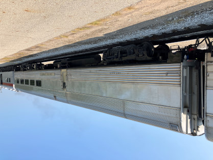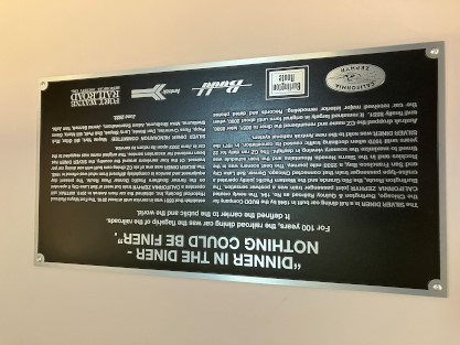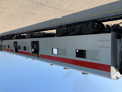 "Dinner in the Diner Nothing could be finer". This car, 8501 "Silver Diner" was built by the Budd Company as their 164. Amtrak dropped the Zephyr name and renumbered it as 8500 and finally 8551. Fort Wayne Railroad Historical Society obtained the car from Amtrak in 2019.