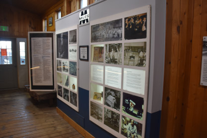 Detail of the 1920-1945 history console with memorabilia and souvenirs.