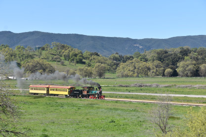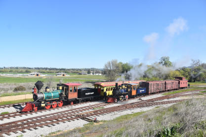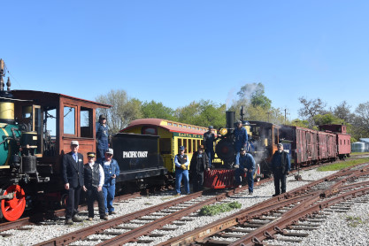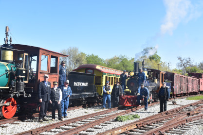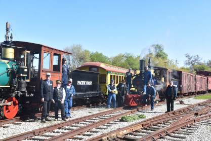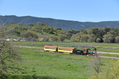 Pacific Coast Railroad 3 pulls its passenger train for photo runby four.