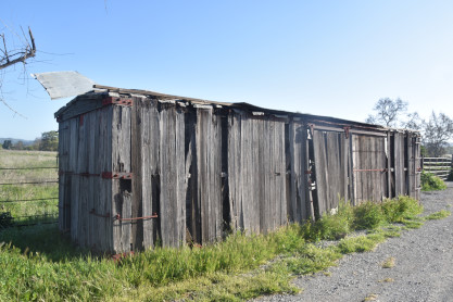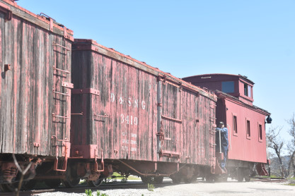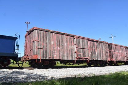 A wooden boxcar used for storage.