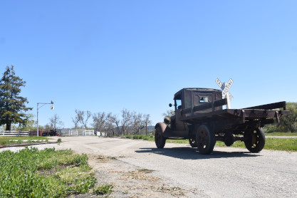 An antique truck at the crossing.