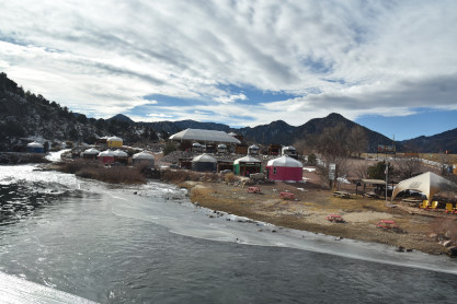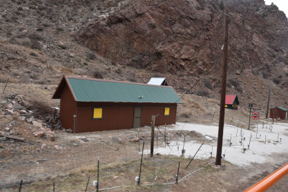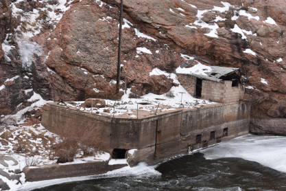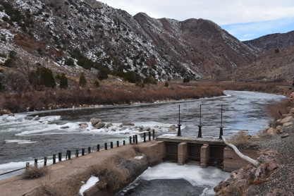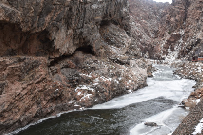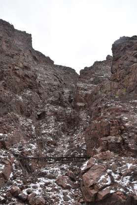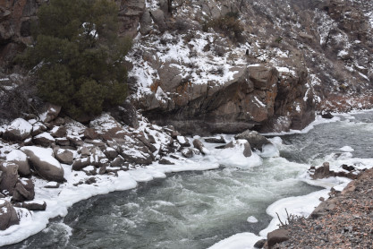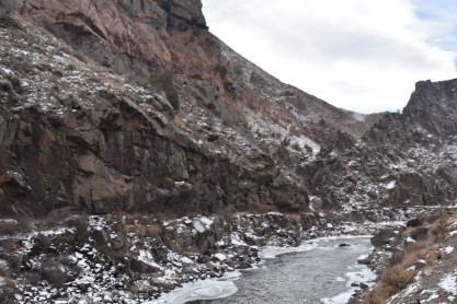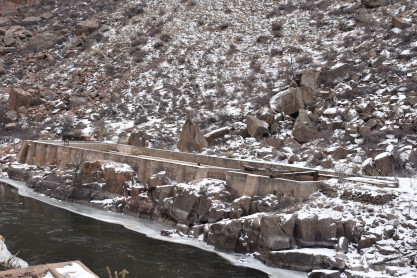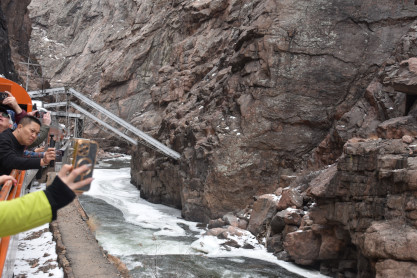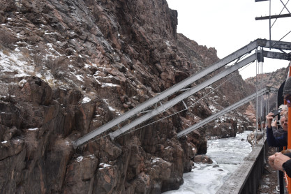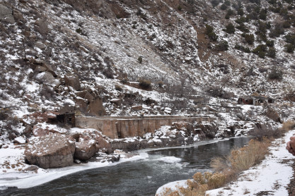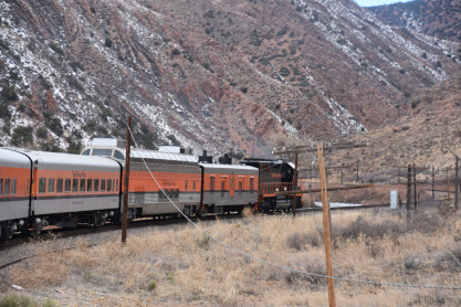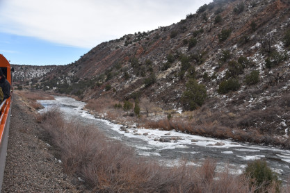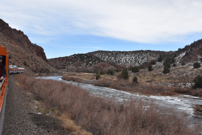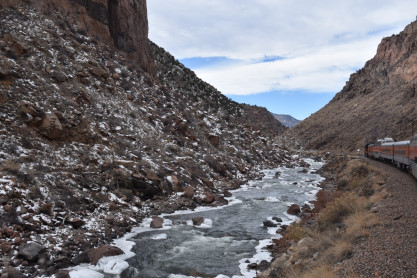 A highlight of the gorge route is the 1879 hanging bridge located along the north side where the gorge narrows to 30 feet and the sheer rocks walls plunge into the river. Designed by Kansas engineer C. Shallor Smith and built by Santa Fe construction engineer A.A. Robinson for $11,759, the bridge consists of a 175-foot plate girder suspended on one side under A-frame girders that span the river and are anchored to the rock walls. Strengthened over the years, the bridge remains in service today.