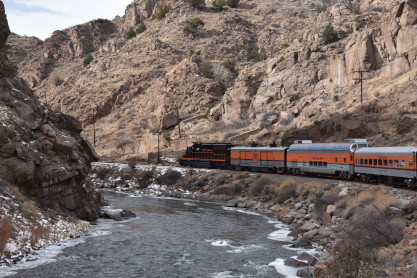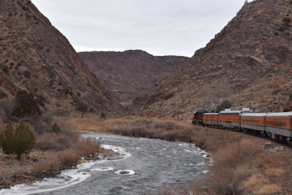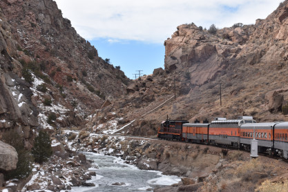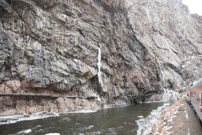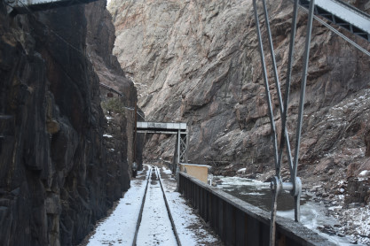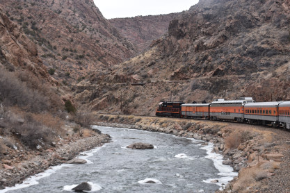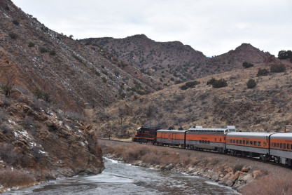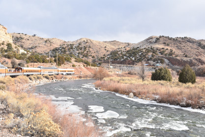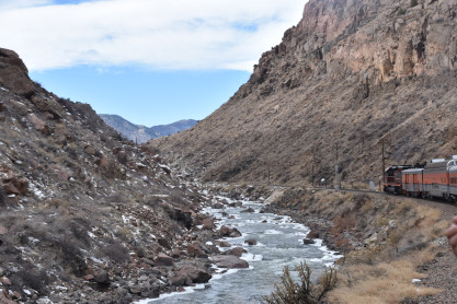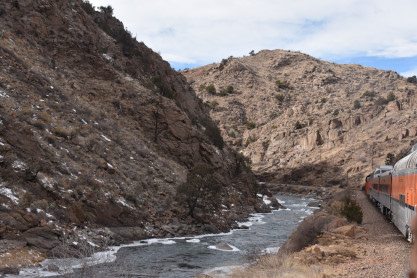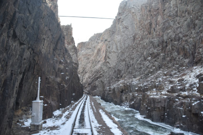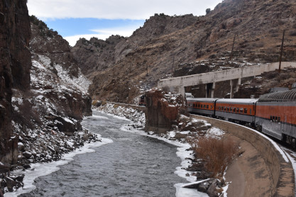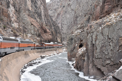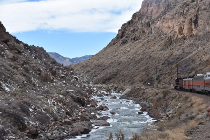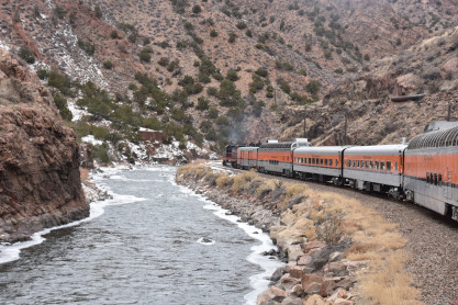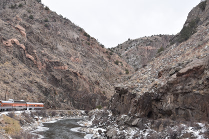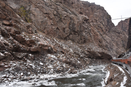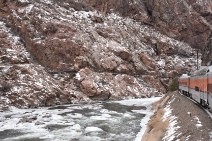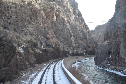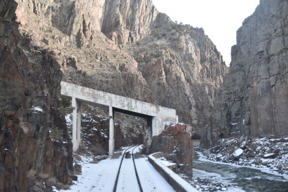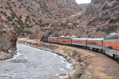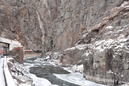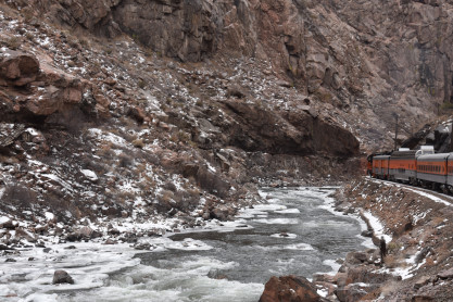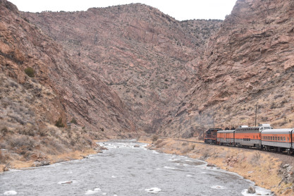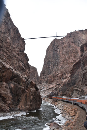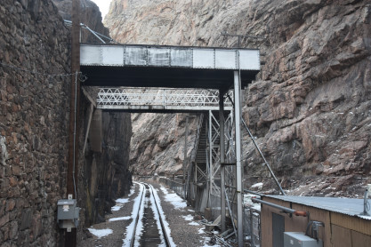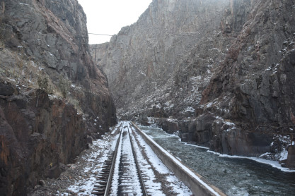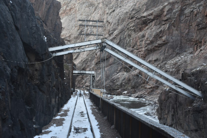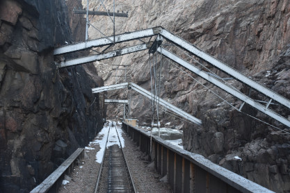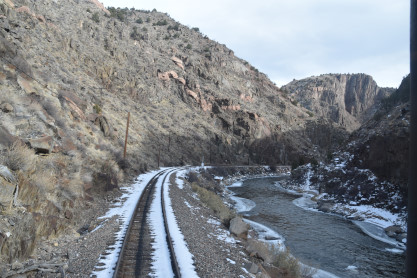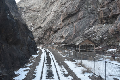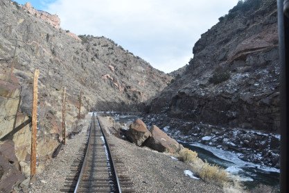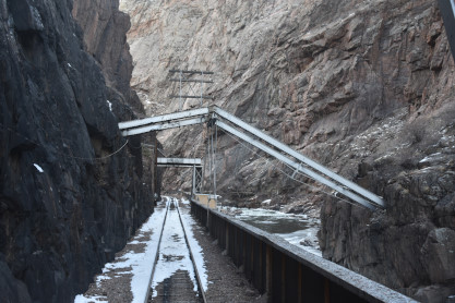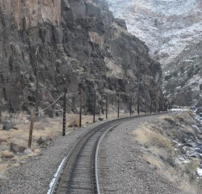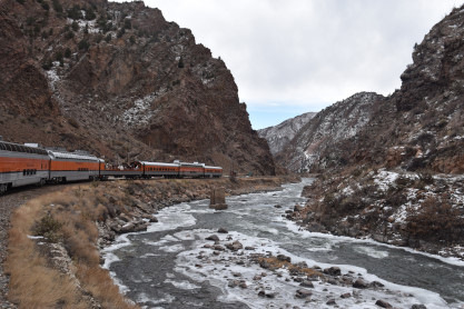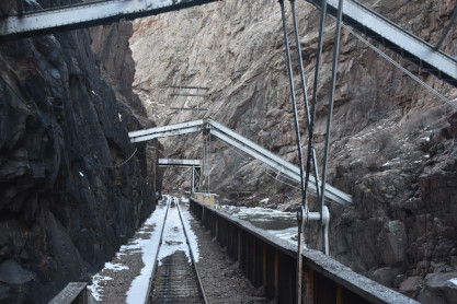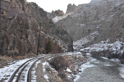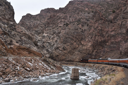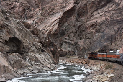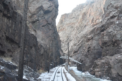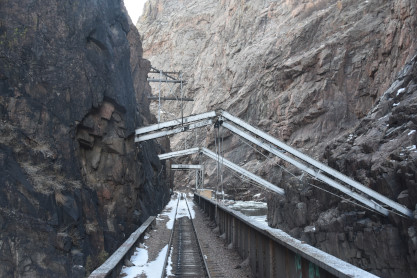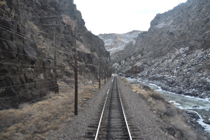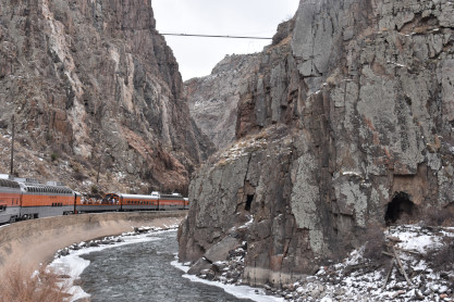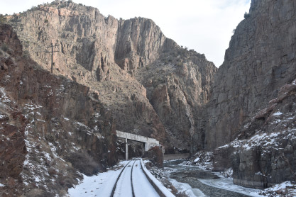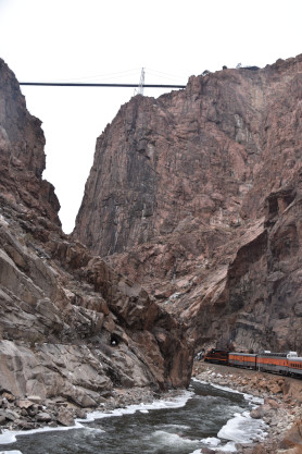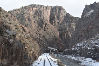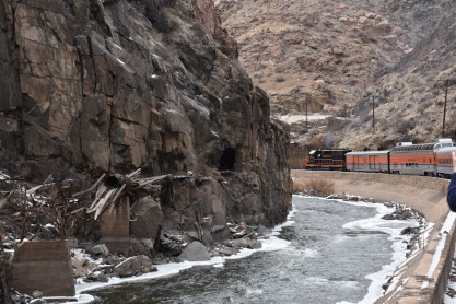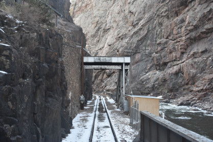 For two railroads to occupy a river valley is not a problem in principle, however, west of Cañon City the Arkansas River cuts through the Royal Gorge, a high plateau of igneous rocks forming a spectacular steep-walled gorge over 1,000 feet deep and 6 miles long. At its narrowest point sheer walls on both sides plunge into the river, creating a nearly impassable barrier. So on this route, two railroads could not share the valley.