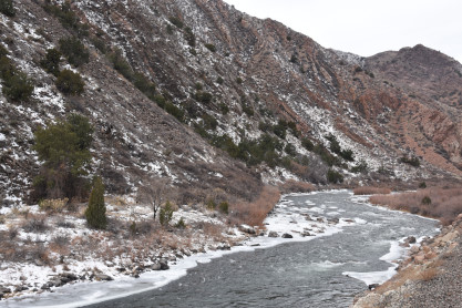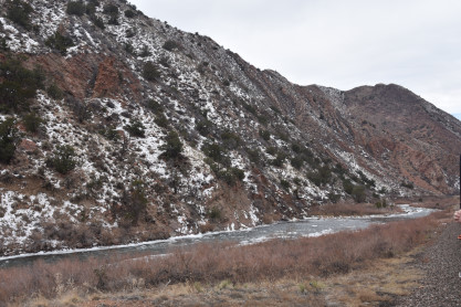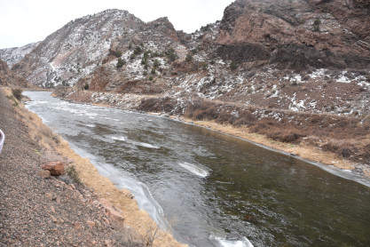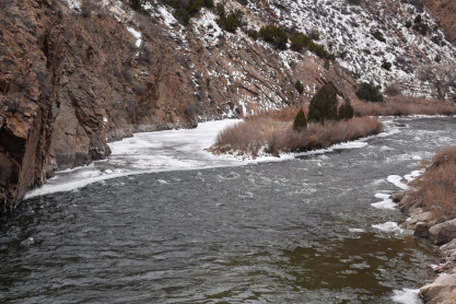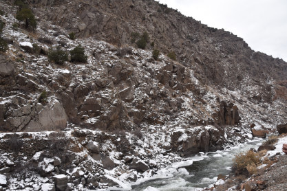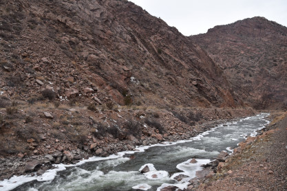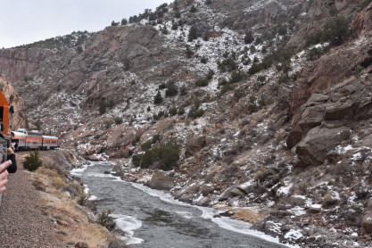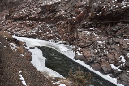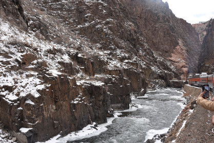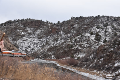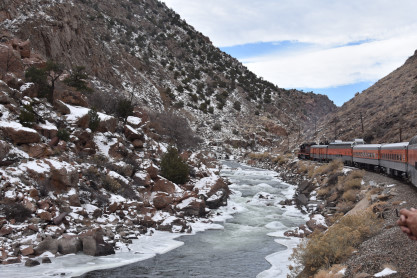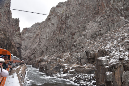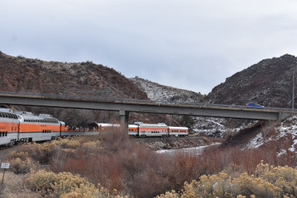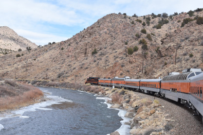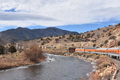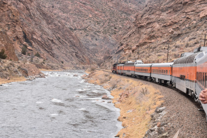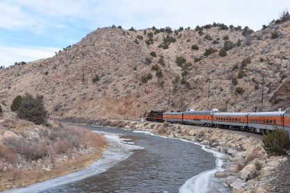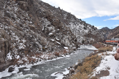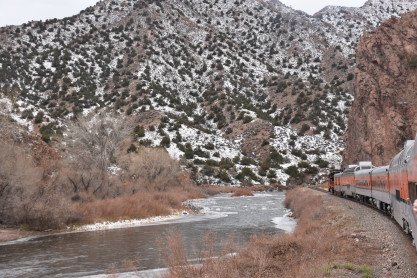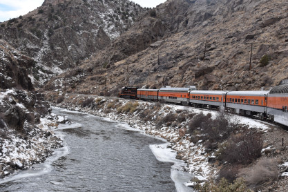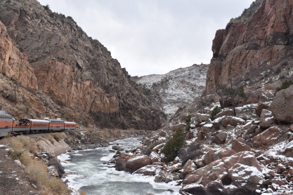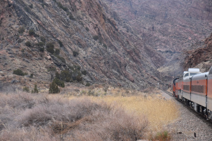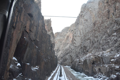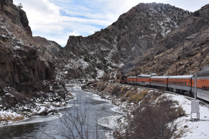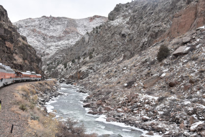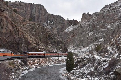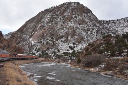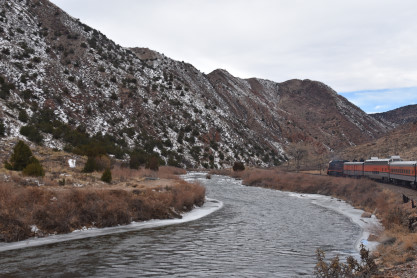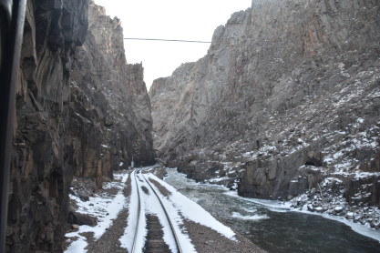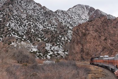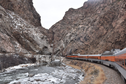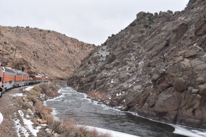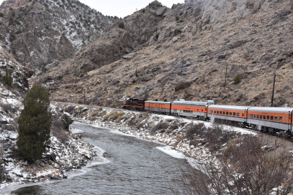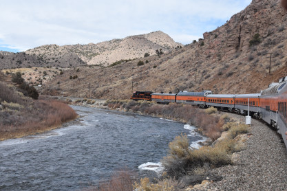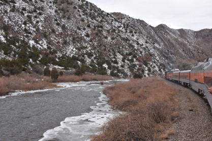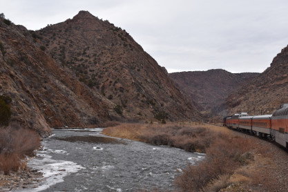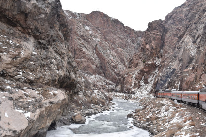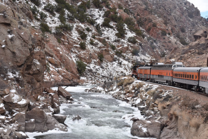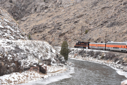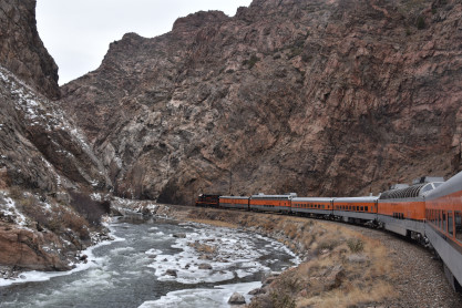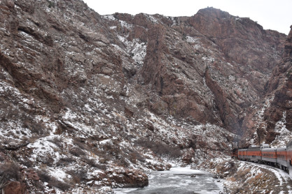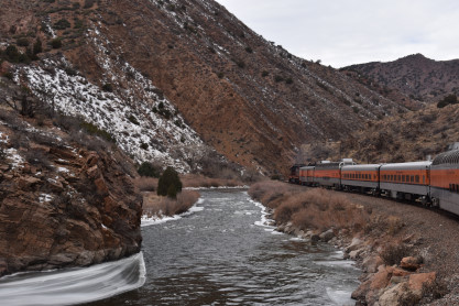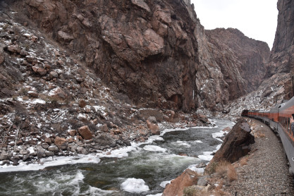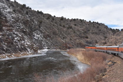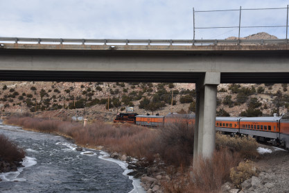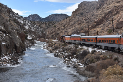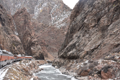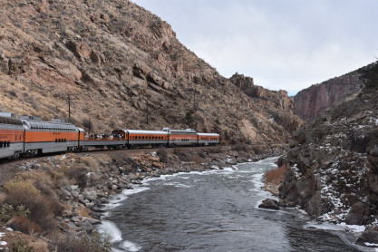 For two railroads to occupy a river valley is not a problem in principle, however, west of Cañon City the Arkansas River cuts through the Royal Gorge, a high plateau of igneous rocks forming a spectacular steep-walled gorge over 1,000 feet deep and 6 miles long. At its narrowest point sheer walls on both sides plunge into the river, creating a nearly impassable barrier. So on this route, two railroads could not share the valley.