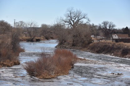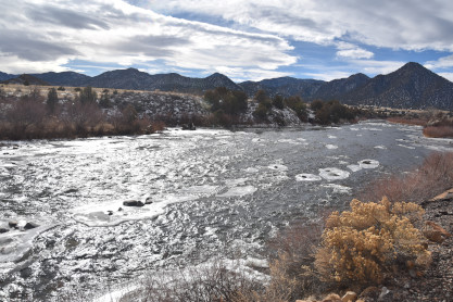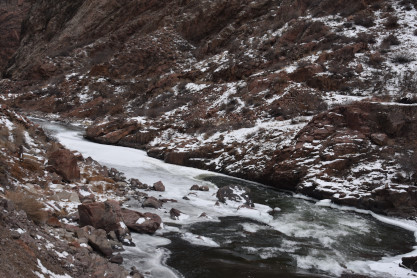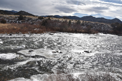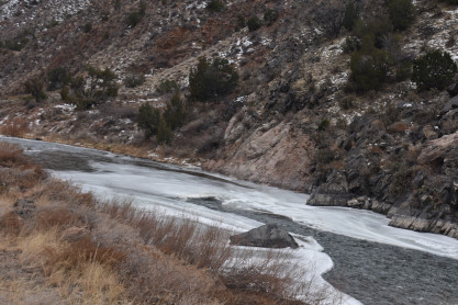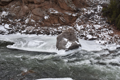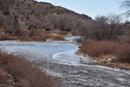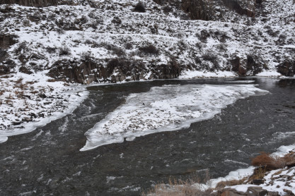 The partially ice-covered river, a first for us since the other times we had ridden were in the spring and summer.