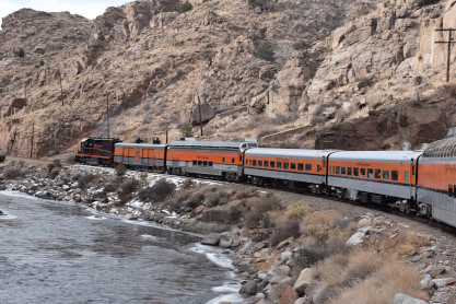 A highlight of the gorge route is the 1879 hanging bridge located along the north side where the gorge narrows to 30 feet and the sheer rocks walls plunge into the river. Designed by Kansas engineer C. Shallor Smith and built by Santa Fe construction engineer A.A. Robinson for $11,759, the bridge consists of a 175-foot plate girder suspended on one side under A-frame girders that span the river and are anchored to the rock walls. Strengthened over the years, the bridge remains in service today Royal Gorge Route Today. The Royal Gorge Route Railroad operates trains year-round through the Royal Gorge from Canon City, Colorado to the western terminus in Parkdale, Colorado. The train is a destination attraction that carries passengers under the Royal Gorge suspension bridge.
