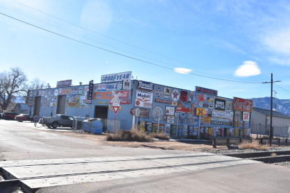 The railroad's building across the road is covered with a variety of petrol company and Americana signs.