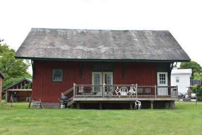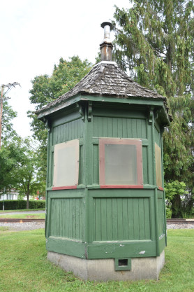 City crossing gates were operated from such as this from 1907 to the 1960s. The Oxford Historical Society dedicated the restored shanty on August 28, 1988, which had been was discovered in a dilapidated condition on the property of Willard Roney, who gave the structure to the society. It took more than five years to locate a suitable site for the shanty and to restore it. Originally there were three such shanties at the Main Street, Merchant Street and Water Street crossings where the railroad passed through the center of the town. These shanties provided shelter and warmth for the persons who were hired by the railroad to stop pedestrian and vehicular traffic as trains approached the crossings. During the heyday of the railroad, there were as many as six regularly-scheduled passenger trains in each direction daily on the Binghamton to Utica division of the Lackawanna railroad. There were numerous freight and milk trains as well. These early guard houses were rectangular in shape. Sometime after 1905, they were replaced by hexagonal buildings from the design seen in this restored shanty. When automatic gates were installed, the watchman's job was eliminated, the shanties abandoned and one by one disappeared.