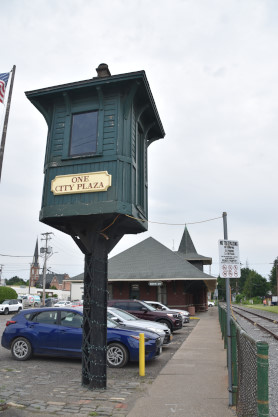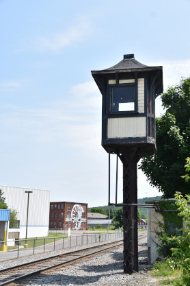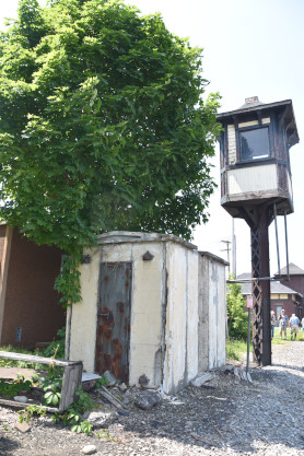Delaware, Lackawanna and Western gatesman's tower dates from circa 1907 and originally stood southeast of the Front Street crossing.