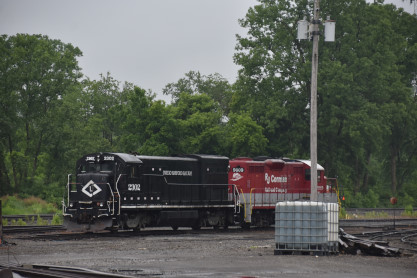 A nice surprise was Owego and Harford Railway U23B 2302, ex. Luzerne and Susquehanna 2302, exx. Lehigh Railway 2302, exxx. Providence and Worcester 2208, exxxx. New York Susquehanna Western 2208, exxxxx. New York Susquehanna and Western 2302, exxxxxx. Big Dog Lines 2208, nee Conrail 2794, built by General Electric in 1977; and R.J. Corman GP9 9009m, nee Baltimore and Ohio 6591 built by Electro-Motive Division in 1958.