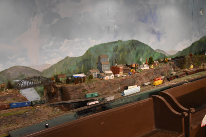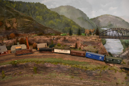 Models of locomotives and freight cars.