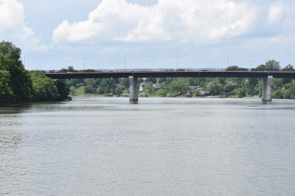 The Norfolk Southern bridge across the Tennessee River complete with a bird's nest on the top right.