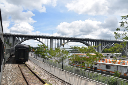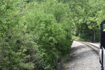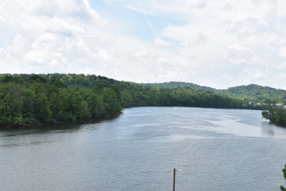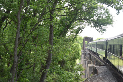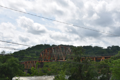 About to cross the Holston River on a three-span Warren through-truss bridge constructed in 1913 from dismantled single-track bridges at Strawberry Plains & Charleston, Tennessee. It is 850 feet above the river.
