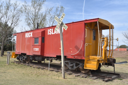 Chicago and North Western caboose 11081, built by International Car in 1965, painted as Rock Island 17201, on display in Centennial Park.