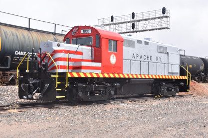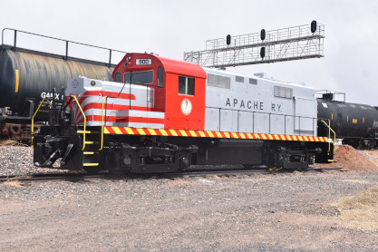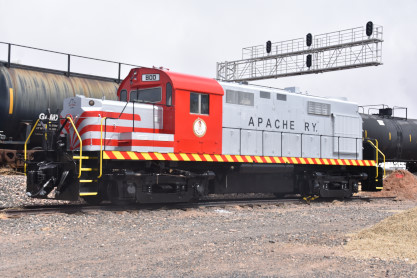 Apache Railroad RS36 800 built by American Locomotive Company in 1962. It was donated to the Navajo County Historical Society in July 2024 and will be put on display at the historic Navajo County Courthouse. The locomotive was just one of 40 RS36s produced for six buyers during a brief 18-month production run. Its rarity has been compounded in the 21st Century not only by the near extinction of the model, but the fact that it remained with the original buyer for more than six decades, along with sisters APA 700 and 900.