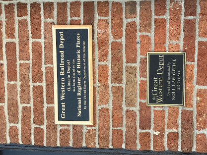 The top plaque states "Great Western Railroad Depot {Lincoln Depot} has been placed on the National Register of Historic Places by the United States Department of the Interior", while the bottom plaque reads "The Great Western Depot owned and maintained by Noll Law Office".