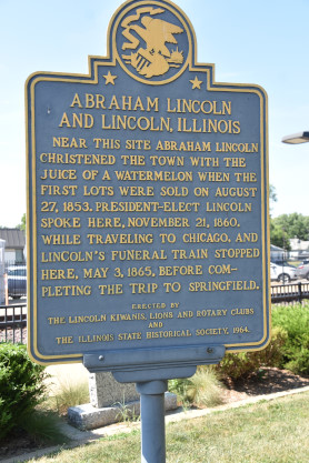 Abraham Lincoln and Lincoln, Illinois Historical Board. Near this site Abraham Lincoln christened the town with the juice of a watermelon when the first lots were sold on August 27, 1853. President-elect Lincoln spoke here, November 21, 1860 while traveling to Chicago, and Lincoln's funeral train stopped here, May 3, 1865, before completing the trip to Springfield.
