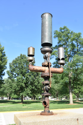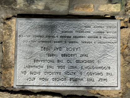 In part, this plaques states "Daily this whistle echoed from atop the Chicago and Alton Railroad Shops on Bloomington's west side. This monument is dedicated to the thousands that labored there."