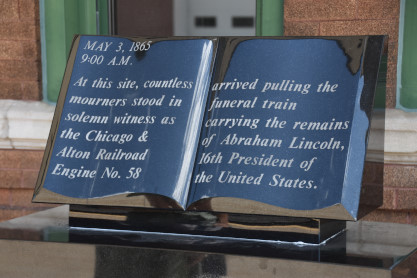 "May 3, 1865 9:00 A.M. At this site, countless mourners stood in solemn witness as the Chicago and Alton Railroad No. 58 arrived pulling the funeral train carrying the remains of Abraham Lincoln, 16th President of the United States.