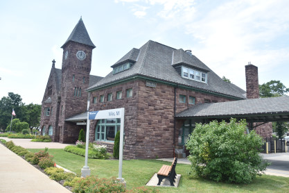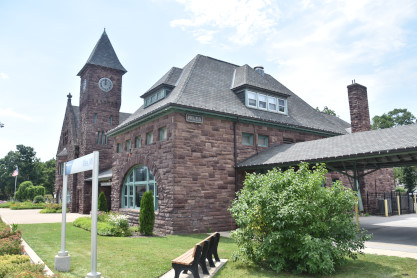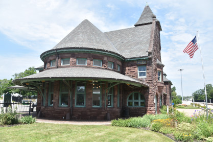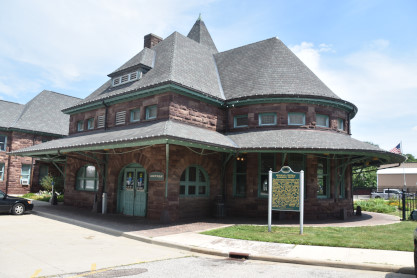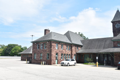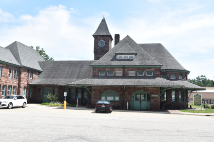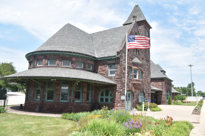 Still in use as a passenger depot, the station has changed little from its original structure. The asymmetrically-planned coursed brownstone structure was built in the Richardsonian Romanesque style, topped by high hipped and gabled roofs. The building is divided into three sections: a 125-foot single-story hip-roofed baggage collection area connected to the main building by a 50-foot-long hip-roofed covered walkway; the lobby, dining, and smoking rooms; and the circular waiting room. The main front gabled section features an arched entrance and second-story bay window, with an apsidal extension surrounded by a veranda. Dominating the station-side façade is a 60-foot high tower housing the station's clock, which was manufactured by Howard Brothers of Boston.