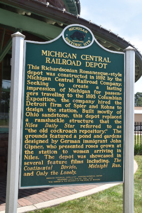 The Niles station was built for the Michigan Central Railroad in 1892, and was placed on the National Register of Historic Places in 1979 and on the Michigan State Register in 1992. The station was planned by architects Frederich Spier and William C. Rohns, and the extensive gardens surrounding the station were designed by John Gipner of Germany.