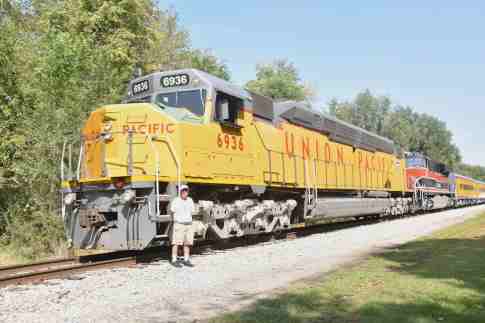 Railroading Heritage of Midwest America DDA40X 6936, nee Union Pacific 6936, built by Electro-Motive Division in 1971. It operated in regular freight service from 1971 to mid-1980 then was stored at Yermo, California, until February 1984 and operated in regular freight service, along with 25 other 6900-class locomotives, from March 1984 through May 1985. It was the last operating DDA40X in service on the railroad and removed from regular freight service on May 6, 1985 then transferred to the Heritage Fleet at Cheyenne and first used in excursion service on May 24, 1985. Union Pacific 6936 was last used in special service in July 2015 for the Cheyenne Frontier Days special, then since it could no longer operate over Union Pacific tracks in the leading position until Positive Train Control equipment was installed, the decision was made to donate it and other equipment to RRHMA in April 2022.