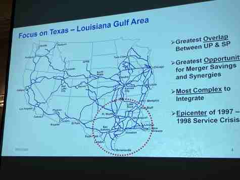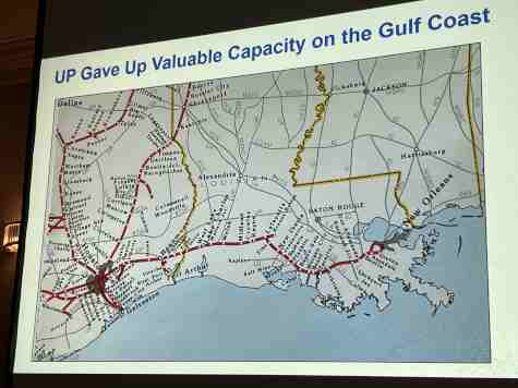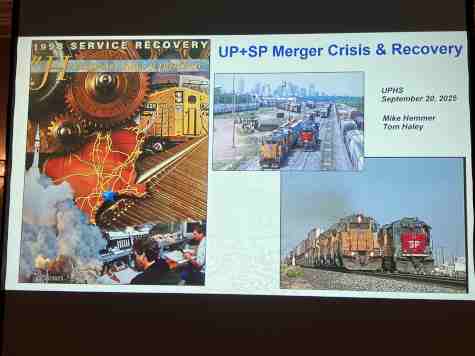 After the banquet, Mike Hemmer (retired Union Pacific Senior Vice President of Law/General Counsel) and Tom Haley (retired Union Pacific Vice President of Network Planning and Operations) gave a presentation titled "Houston, We Have a Problem" which explored the causes and remarkable recovery from the catastrophic system-wide service crisis after the UP/SP merger. These are five slides from that presentation. To round out the evening, the raffle and silent auction winners were announced and some old Union Pacific commercials were shown.