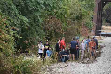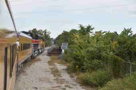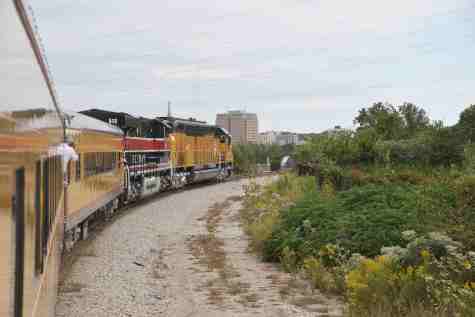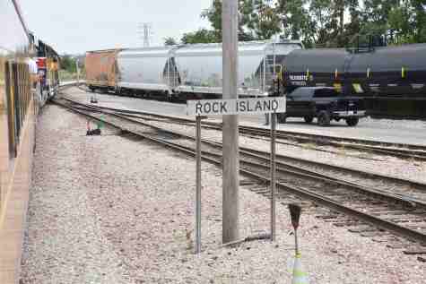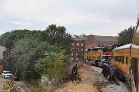 A few of the many passengers making their way to the boarding area. The brick building is National Railway Equipment's office, housed in a former Chicago, Rock Island and Pacific building; NRE used to own the former Rock Island shops here.