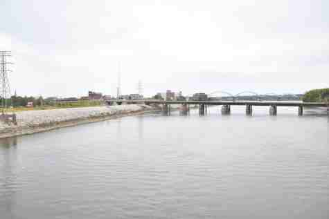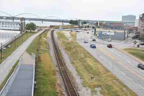 Crossing the Mississippi River on the Arsenal Bridge, with the Centennial bridge in the background.