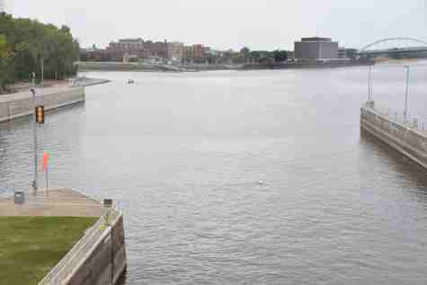 The locks used to raise or lower ships on the Mississippi River. The Centennial bridge is in the background.