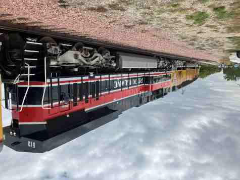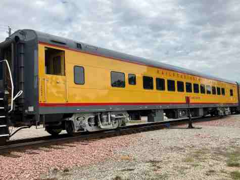 Railroading Heritage of Midwest America 44-seat coach "Portland Rose", ex. Union Pacific "Portland Rose" 1990, nee Union Pacific 5473, built by American Car and Foundry in 1953. It was re-named after the train Portland Rose, which operated between Chicago and Portland. This car featured a radio, soda fountain, maid service, hairdresser, barber valet and bath. The rose was the decorative motif for this train. "Portland Rose" remained in revenue service until 1971. In April 2022, Union Pacific announced its donation to RRHMA.