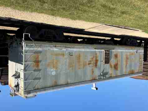 General American Pfaudler milk car 1021, built by General American Transportation in 1947, designed for hauling 8,000 gallons of fresh milk inside large stainless steel tanks. It is fitted with special trucks for express service and is one of the largest bulk milk cars ever built. For a time, it was assigned to the Mars candy-making company, transporting milk to be used in chocolate production. Later, probably in the 1960s, this car was reassigned to transport 140-proof bourbon between Owensboro, Kentucky and Peekskill, New York, for Fleischmann Distilling. This ended in 1970, when liquor was designated a hazardous substance, meaning that cars with internal tanks, such as this one, could not transport it because leaks were unable to be easily detected from outside the car. GPEX 1021 was then briefly assigned to transport vinegar instead before it was retired and donated to IRM.